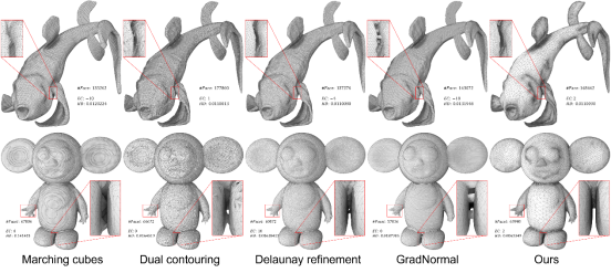 获奖论文以隐式曲面网格化为研究主题,提出了系统的解决方案。针对高质量三角化的目标,提出以四面体镶嵌代替六面体镶嵌的空间离散化手段;针对高速度的目标,提出计算量更少的表面蔓延策略;针对保细节、保拓扑的目标,提出自适应四面体镶嵌的策略。该方法将隐式曲面/点云曲面的网格化与低质量网格曲面的重新网格化有机地统一起来,并且极大地调和了高质量、高速度、高保真三大目标之间的矛盾。实验结果如图3所示。
