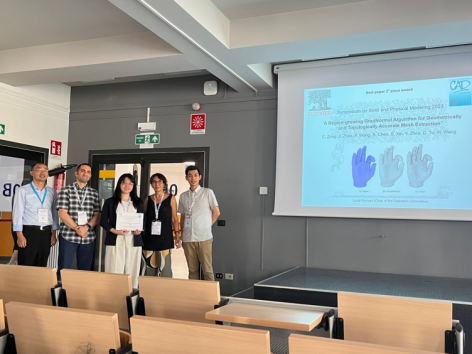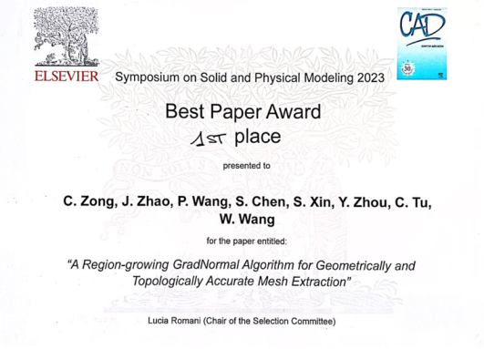 在意大利热那亚举办的Symposium on Solid and Physical Modeling (SPM) 2023大会上,yh1122银河国际交叉研究中心科研团队发表的《A Region-growing GradNormal Algorithm for Geometrically and Topologically Accurate Mesh Extraction》荣获最佳论文奖,并且排名第一(图1、图2)。文章第一作者为2019级博士研究生宗辰,指导教师包括王文平教授、屠长河教授、周元峰教授、辛士庆副教授和陈双敏副教授。