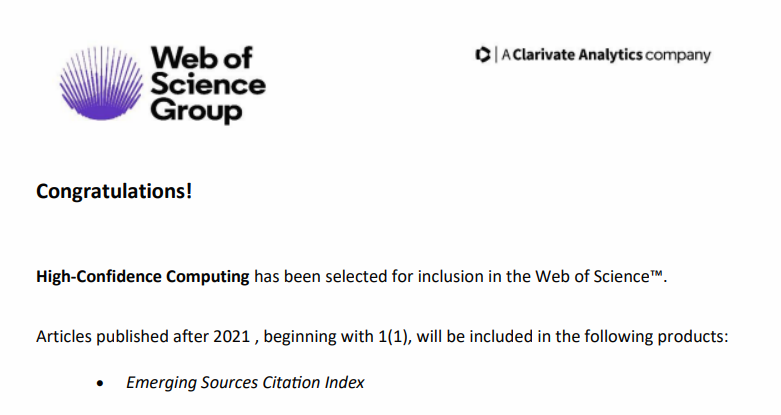 近日,由yh1122银河国际主办、yh1122银河国际科技期刊社与爱思唯尔(Elsevier)联合出版,yh1122银河国际承办的国际学术期刊High-Confidence Computing(《高置信计算(英文)》,ISSN2667-2952)通过科睿唯安旗下Web of Science委员会评审,正式被ESCI(Emerging Source Citation Index,新兴来源引文索引)数据库收录。